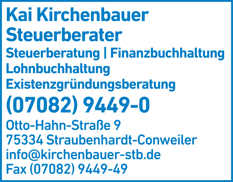 Die Adresse von Kirchenbauer Kai Steuerberater lautet: Otto-Hahn-Str. 9, 75334 Straubenhardt