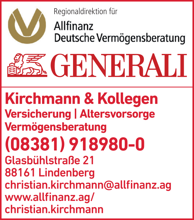 Kirchmann Christian - Allfinanz Deutsche Vermögensberatung Versicherungsbüro - Vermögensberater führt die Marke(n) Deutsche Bank, Allfinanz, Generali Deutschland AG, Central Krankenversicherungs AG, Badenia Bausparkasse, Advocard, DWS Investment, Geiger Edelmetalle und Allianz Global Investors.