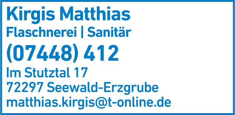 Die Adresse von Kirgis Matthias Flaschnerei lautet: Im Stutztal 17, 72297 Seewald-Erzgrube