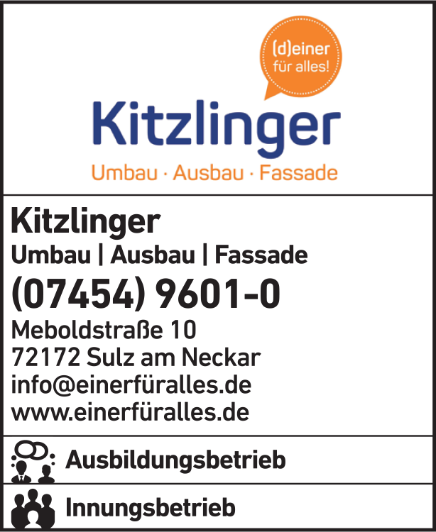 Die Adresse von Kitzlinger GmbH Umbau, Ausbau, Fassade lautet: Meboldstr. 10, 72172 Sulz am Neckar