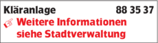 Kläranlage hat montags bis dienstags von 08:30 - 12:00 Uhr und 14:00 - 16:00 Uhr, mittwochs von 08:30 - 12:00 Uhr, donnerstags von 08:30 - 12:00 Uhr und 14:00 - 16:00 Uhr und freitags von 08:30 - 12:00 Uhr geöffnet.
