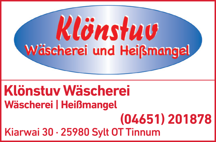Die Adresse von Klönstuv Wäscherei Heißmangel-Waschsalon lautet: Kiarwai 30, 25980 Sylt Tinnum