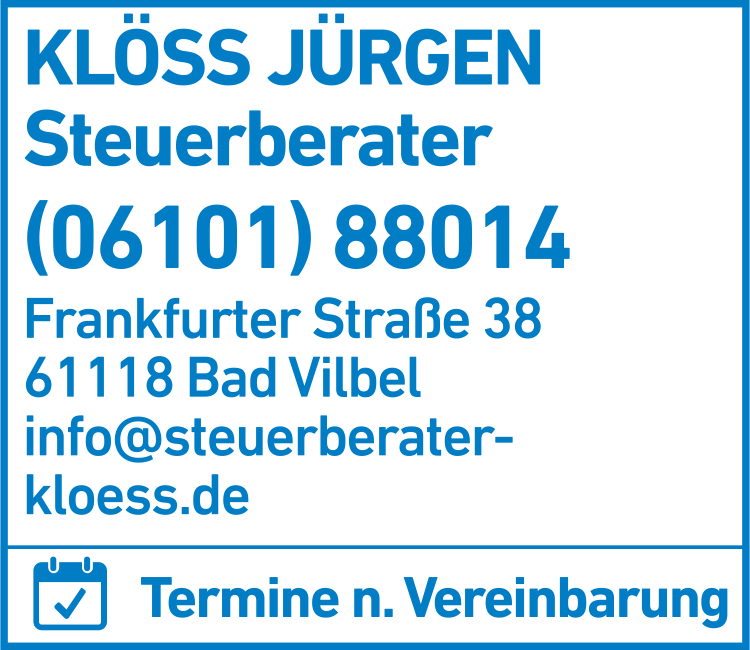 Die Adresse von Klöss Jürgen Steuerberater lautet: Frankfurter Str. 38, 61118 Bad Vilbel
