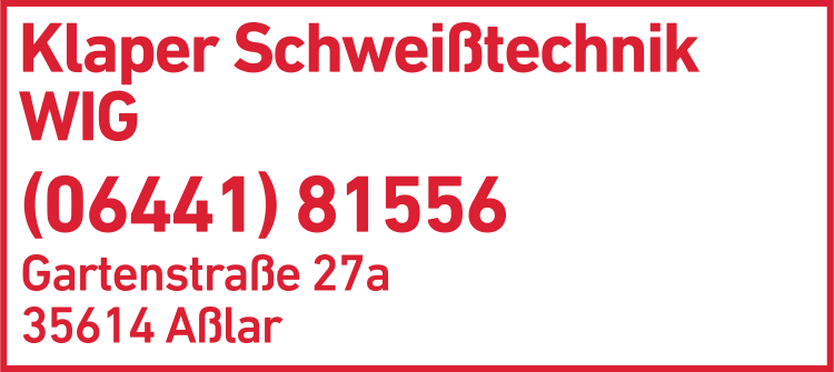 Die Adresse von Klaper Schweißtechnik WIG lautet: Gartenstr. 27 a, 35614 Aßlar