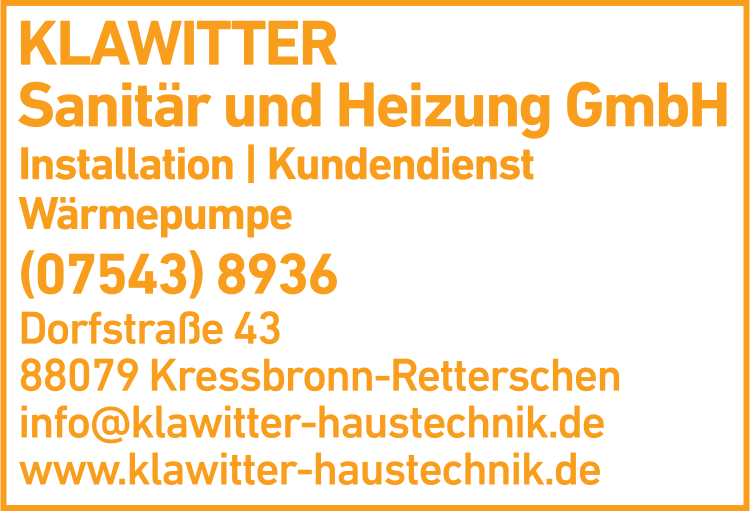 Die Adresse von Klawitter Sanitär u. Heizung GmbH lautet: Dorfstr. 43, 88079 Kressbronn