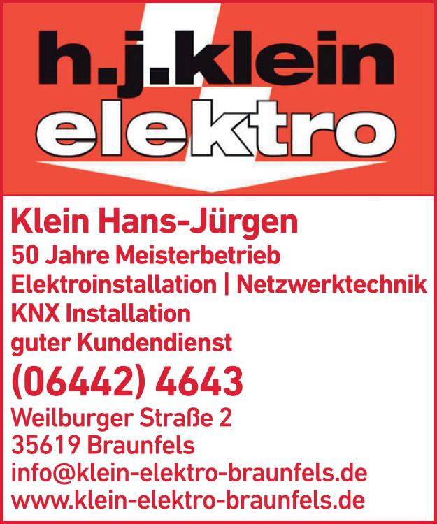 Die Adresse von Klein Hans-Jürgen Elektroinstallation lautet: Weilburger Str. 2, 35619 Braunfels