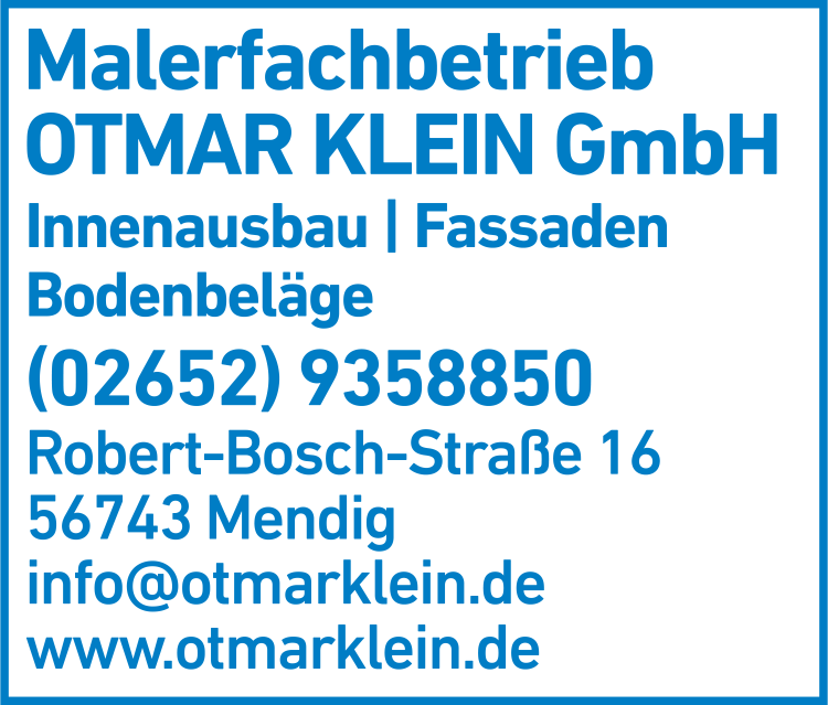 Die Adresse von Klein Otmar GmbH Malerfachbetrieb lautet: Robert-Bosch-Str. 16, 56743 Mendig