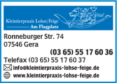 Die Adresse von Kleintierpraxis Lohse/Feige lautet: Ronneburger Str. 74, 07546 Gera