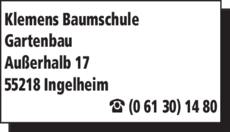 Die Adresse von Klemens Baumschule lautet: Außerhalb 17, 55218 Ingelheim
