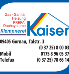 Die Adresse von Klempnerei Kaiser lautet: Talstr. 3, 09405 Gornau