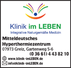 Klinik im LEBEN bietet Schmerztherapie, Naturheilverfahren, Gesundheitsvorsorge, biologische Krebsmedizin, Ernährungsmedizin, Mitteldeutsches Hyperthermiezentrum, SOL Hypnose, Immuntherapie, Informationstherapie und Fiebertherapie an.