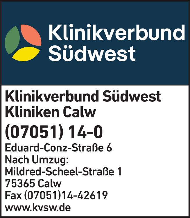 Die Adresse von Klinikverbund Südwest lautet: Eduard-Conz-Str. 6, 75365 Calw