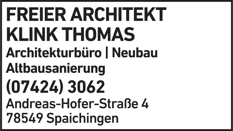 Die Adresse von Klink Thomas Dipl. - Ing. Freier Architekt lautet: Andreas-Hofer-Str. 4, 78549 Spaichingen