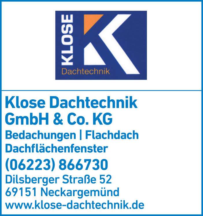 Klose Dachtechnik GmbH & Co. KG 06223 86 67 30 Neckargemünd Dilsberger Str. 52 69151 de.teleauskunft.oetb.webapp2.detail.Graphic@18a0af77