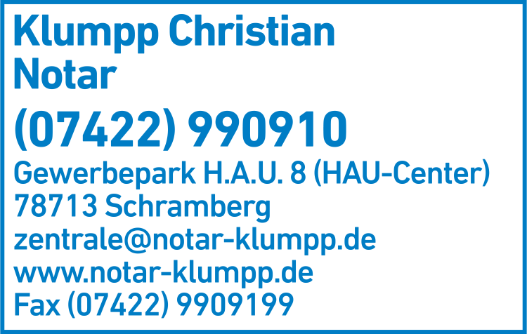 Die Adresse von Klumpp Christian Notar lautet: Gewerbepark H.A.U. (HAU-Center) 8, 78713 Schramberg