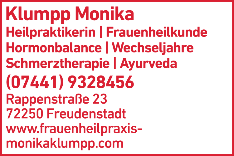 Die Adresse von Klumpp Monika lautet: Rappenstr. 23, 72250 Freudenstadt