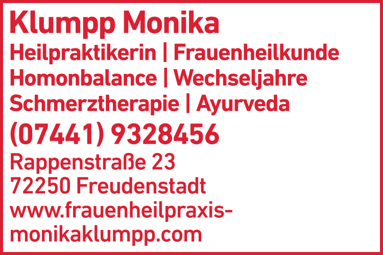 Die Adresse von Klumpp Monika Naturheilpraxis lautet: Rappenstr. 23, 72250 Freudenstadt