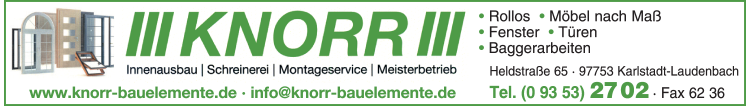 Die Adresse von Knorr Bauelemente lautet: Heldstr. 65, 97753 Karlstadt-Laudenbach