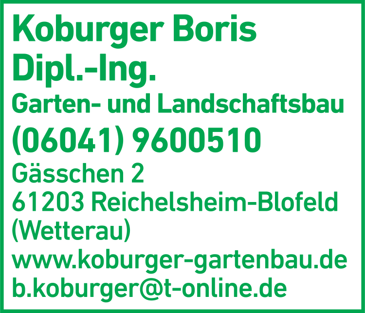 Koburger Boris Dipl. - Ing. Garten- u. Landschaftsbau 06041 9 60 05 10 Reichelsheim Gässchen 2 61203 Blofeld de.teleauskunft.oetb.webapp2.detail.Graphic@5163dc10