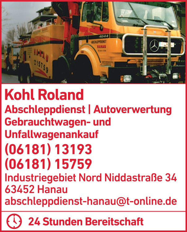 Die Adresse von Kohl Roland Abschleppdienst lautet: Niddastr. 34, 63452 Hanau