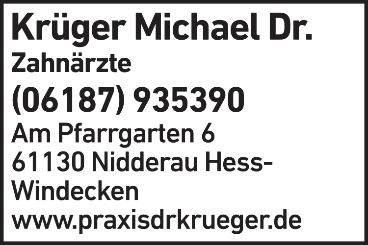 Die Adresse von Krüger Michael Dr. Zahnarztpraxis lautet: Am Pfarrgarten 6, 61130 Nidderau