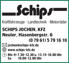 Die Adresse von Kraftfahrzeuge Jochen Schips lautet: Hasenbergstr. 6, 73491 Neuler