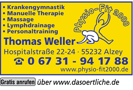 Die Adresse von Krankengymn. Weller, Physio-Fit 2000 lautet: Hospitalstr. 22-24, 55232 Alzey