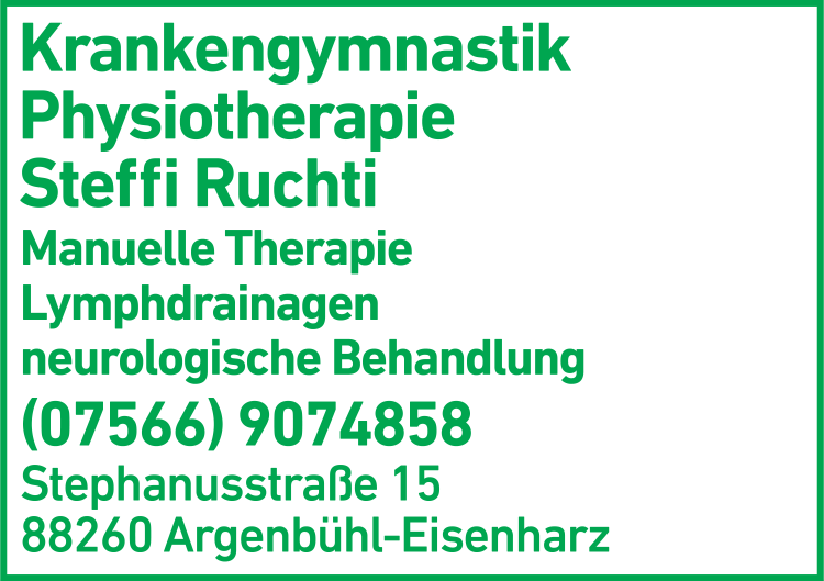 Die Adresse von Krankengymnastik Ruchti lautet: Stephanusstr. 15, 88260 Argenbühl