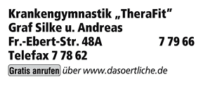 Krankengymnastik "TheraFit" Graf Silke u. Andreas bietet Physiotherapie, Neurologie, Prävention, TheraFit, Krankengymnastik, Lymphdrainage, WS-Gymnastik, Beckenbodentraining, KG und Sportphysiotherapie an.