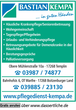 Krankenpflege KEMPA Bastian 03987 7 48 77 Templin Obere Mühlenstr. 10 a 17268 https://media.roeser-online.de/02/240/LOGO/000/315/615_200x100.png