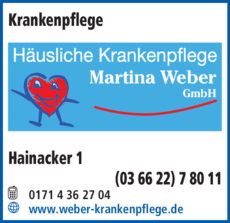 Die Adresse von Krankenpflege Martina Weber lautet: Hainacker 1, 07950 Zeulenroda-Triebes