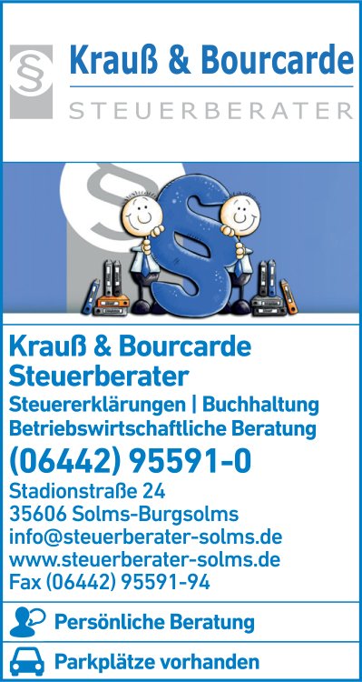 Die Adresse von Krauß & Bourcarde Steuerberater lautet: Stadionstr. 24, 35606 Solms