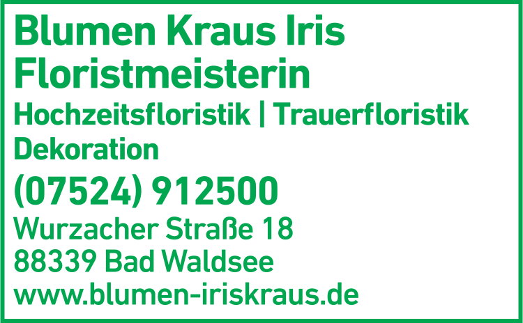 Die Adresse von Kraus Iris Blumen lautet: Wurzacher Str. 18, 88339 Bad Waldsee