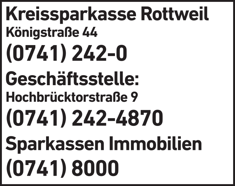 Die Adresse von Kreissparkasse Rottweil lautet: Königstr. 44, 78628 Rottweil