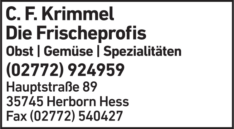 Die Adresse von Krimmel C. F. Obst- und Gemüsegeschäft lautet: Hauptstr. 89, 35745 Herborn