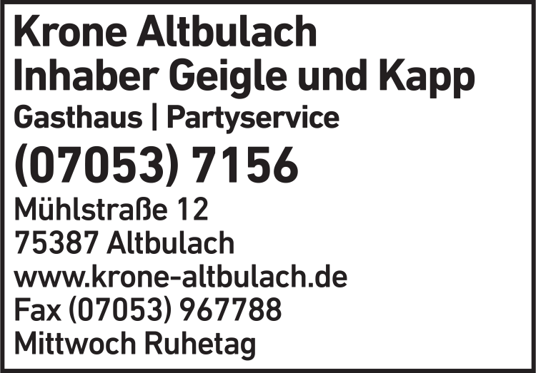 Die Adresse von Krone Altbulach Inh. Geigle und Kapp lautet: Mühlstr. 12, 75387 Neubulach