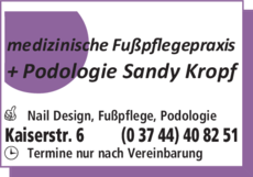 Die Adresse von Kropf Sandy Podologie lautet: Kaiserstr. 6, 08209 Auerbach