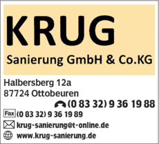 Die Adresse von Krug Sanierung GmbH & Co. KG lautet: Halbersberg 12 A, 87724 Ottobeuren