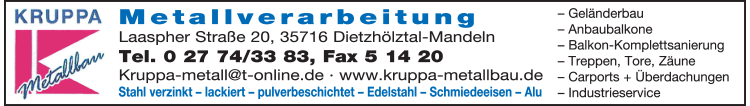Die Adresse von Kruppa Frank Metallverarbeitung lautet: Laaspher Str. 20, 35716 Dietzhölztal-Mandeln