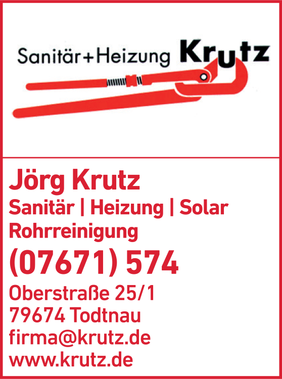 Krutz Jörg Sanitär + Heizung 07671 5 74 Todtnau Oberstr. 25/1 79674