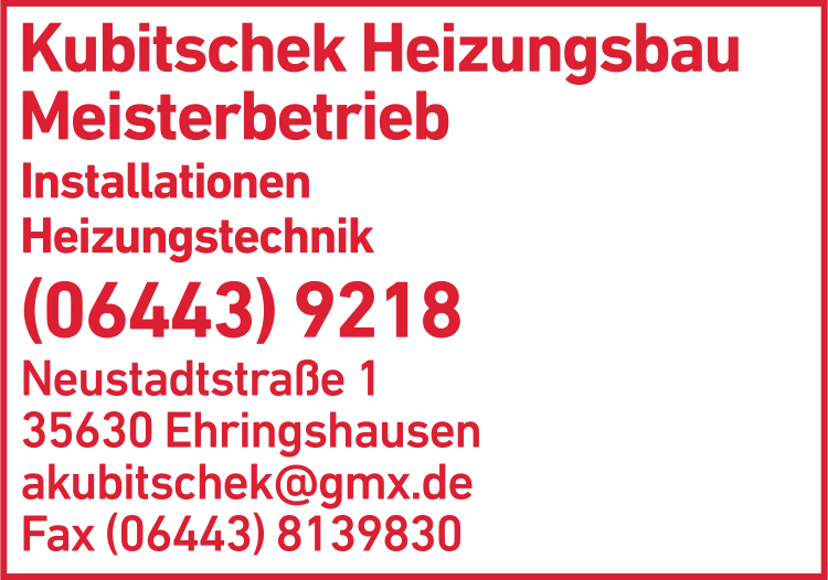 Kubitschek André Installation + Heizungstechnik 06443 92 18 Ehringshausen Neustadtstr. 1 35630