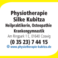 Die Adresse von Kubitza Silke - Physiotherapie, Osteopathie & Heilpraktikerin lautet: Am Ringpark 1 E, 01640 Coswig