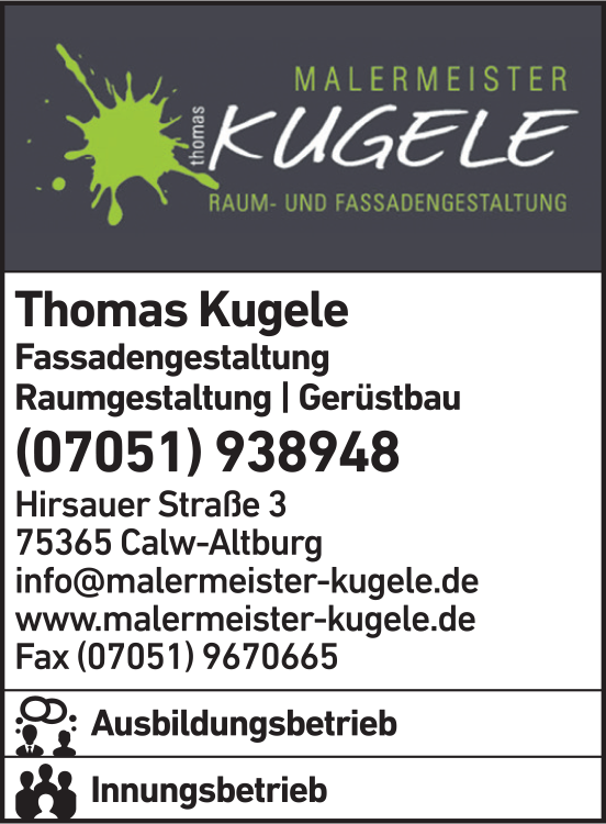 Die Adresse von Kugele Thomas Malermeister lautet: Hirsauer Str. 3, 75365 Calw
