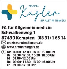 Kugler Michael bietet Facharzt für Allgemeinmedizin, Ärzte: Allgemeinmedizin (Fachärzte), Gelbfieberimpfstelle, Reisemedizin, Reisemedizinische Beratung, Sonographische Untersuchungen, Sprechstunde für Groß und Klein, Therapiemanagement, Vertragsärztliche Grundversorgung und Vorsorgeuntersuchungen an.