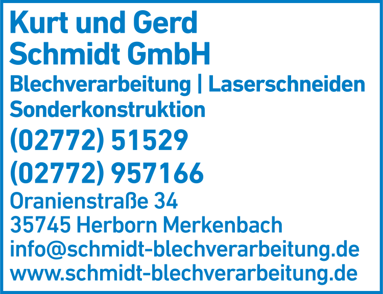Die Adresse von Kurt + Gerd Schmidt GmbH Blechverarbeitung lautet: Oranienstr. 34, 35745 Herborn-Merkenbach