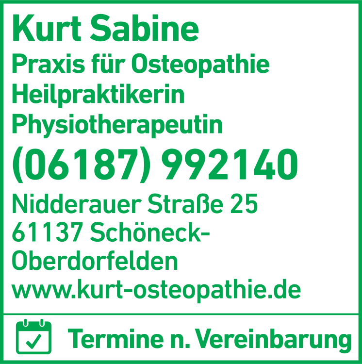 Die Adresse von Kurt Sabine Praxis für Osteopathie lautet: Nidderauer Str. 25, 61137 Schöneck-Oberdorfelden