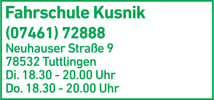 Die Adresse von Kusnik Fahrschule lautet: Neuhauser Str. 9, 78532 Tuttlingen