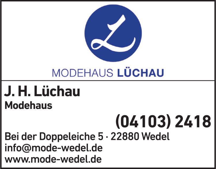 Die Adresse von Lüchau J. H. Modehaus lautet: Bei der Doppeleiche 5, 22880 Wedel