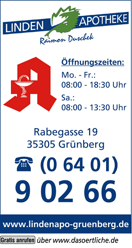 Die Adresse von LINDEN - APOTHEKE lautet: Rabegasse 19, 35305 Grünberg