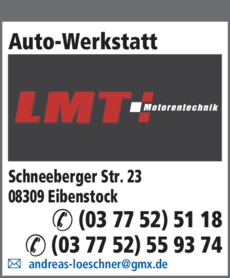 Die Adresse von LMT Motorentuning Inh. Andreas Löschner lautet: Schneeberger Str. 23, 08309 Eibenstock